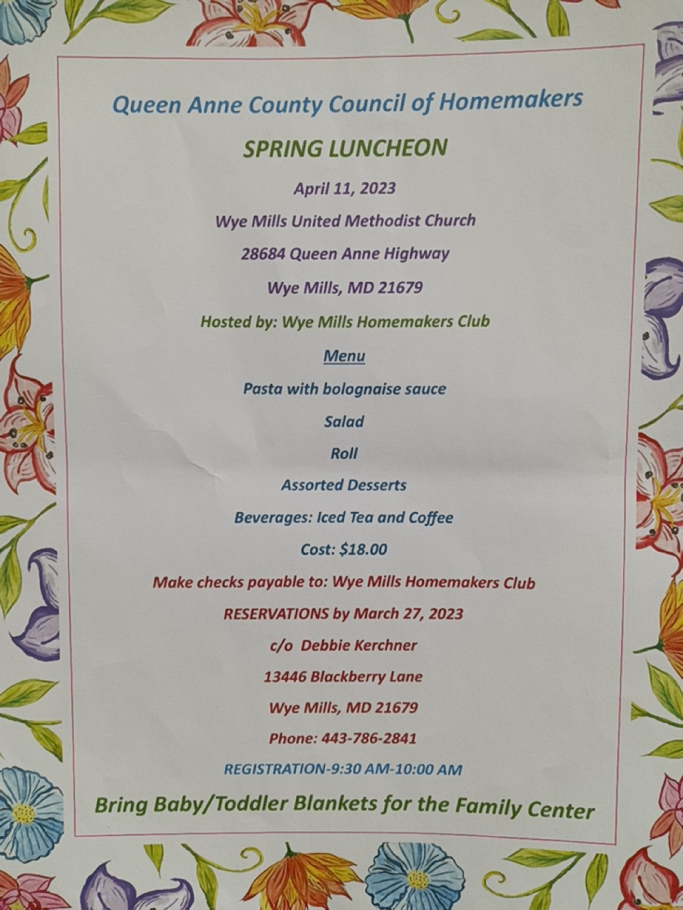 Spring Luncheon for Queen Anne County Council of Homemakers April, 11, 2023 by Mike Dow on February 2, 2023 in Events